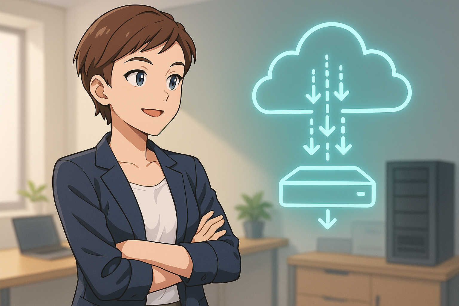 Een anime-stijl illustratie van een glimlachende vrouw die de eenvoud van Veeam's backupinterface toont met een externe harde schijf en een NAS op haar bureau.